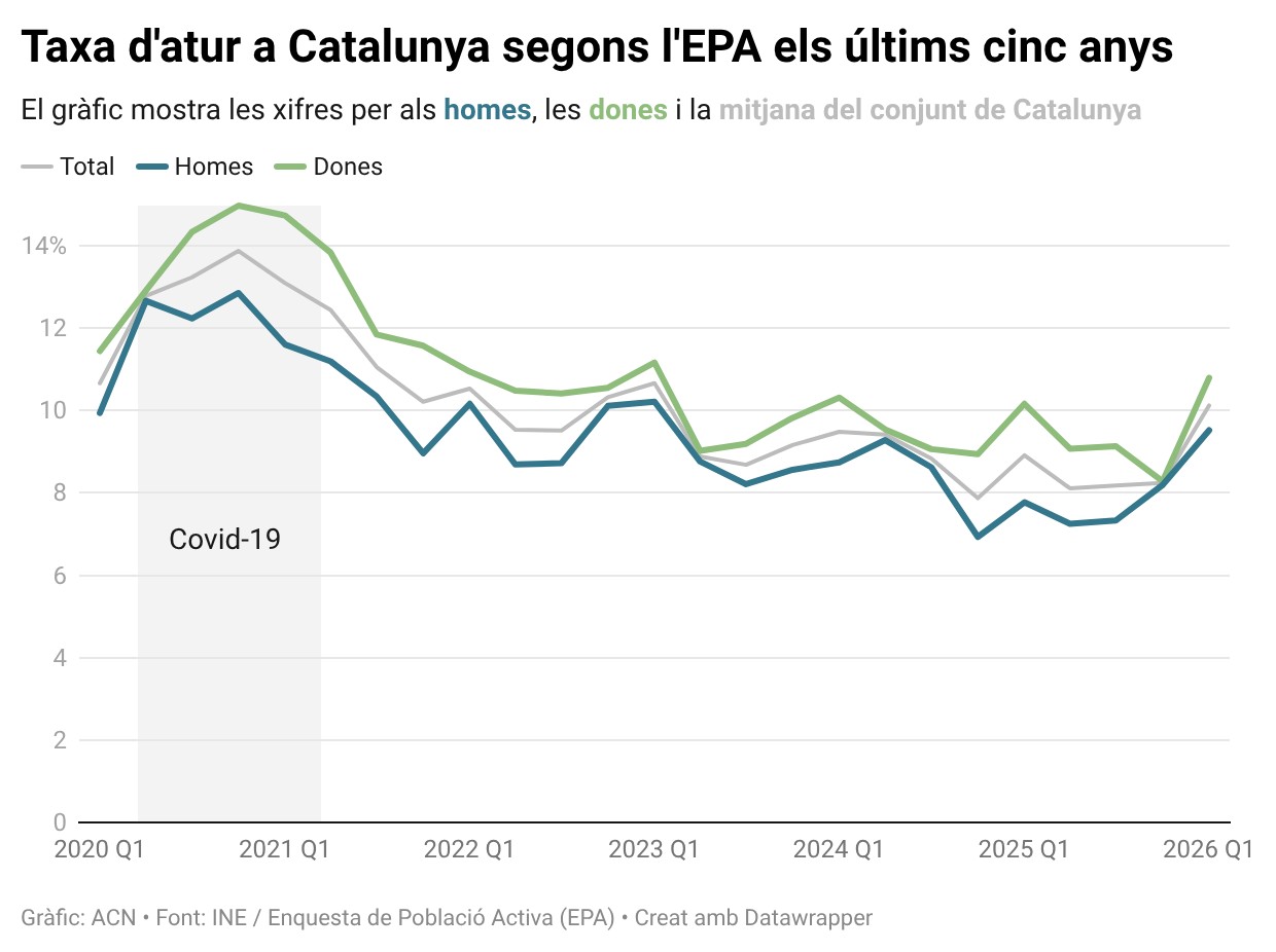 L’estadística mostra un augment trimestral de prop de 2 punts, l’increment més pronunciat en un primer trimestre des del 2009. La taxa de desocupació no s’havia situat per sobre del 10% des del primer trimestre del 2023. L’indicador arrossegava dos mesos pla amb increments molt lleugers que no superaven la dècima i ha experimentat un canvi de tendència en aquest primer trimestre del 2026.