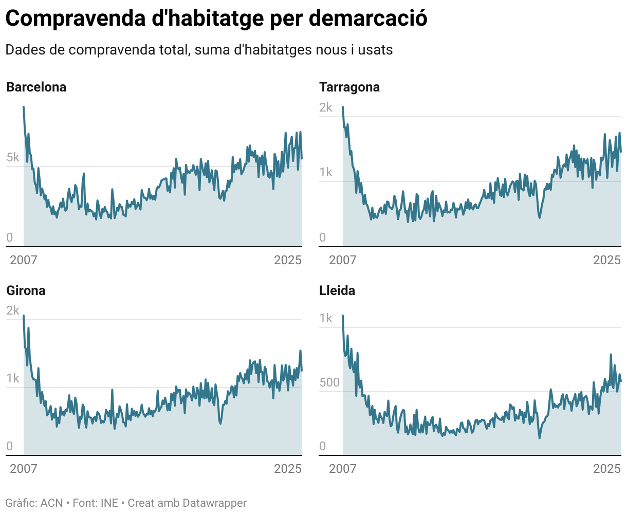 ACN Barcelona – La compravenda d’habitatges va tancar el novembre amb 8.794 operacions, un 2,3% més que el mateix període de l’any passat, segons les dades provisionals de l’Estadística de Transmissions de Drets de la Propietat de l’Institut Nacional d’Estadística (INE). D’aquesta manera, les transaccions encadenen tres mesos d’increments interanuals, malgrat que el creixement s’ha anat moderant (+3% a l’octubre i +6% al setembre). Les prop de 8.800 operacions del novembre també representen un màxim en aquest mes des del 2022, quan es van registrar 8.897 operacions. Per demarcacions, Barcelona va ser l’única on van baixar lleugerament respecte de l’any passat (-0,13%), mentre que van augmentar a Girona (+7,1%), Lleida (+3,2%) i Tarragona (+7,8%).
