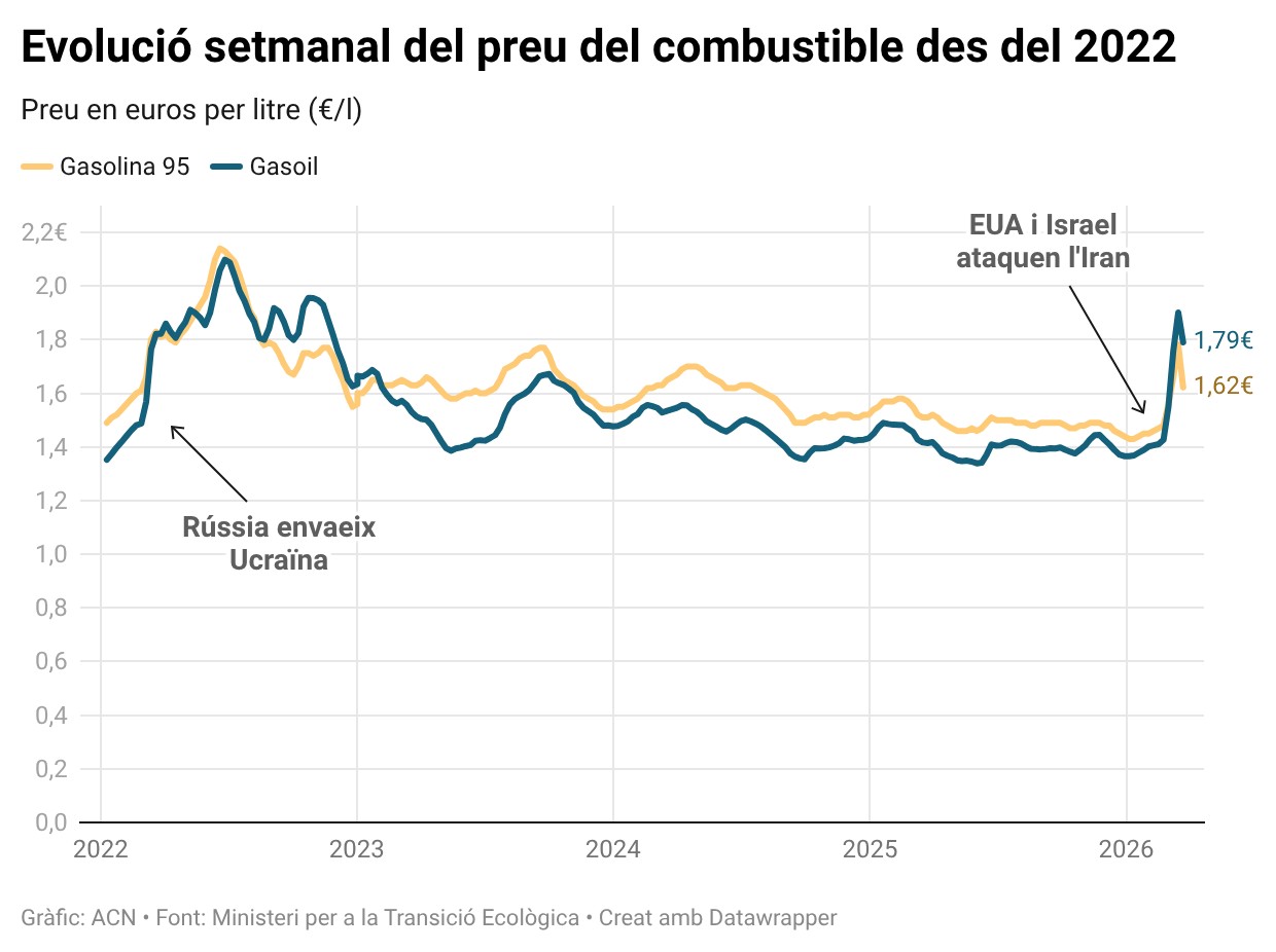 El preu dels combustibles ha pujat de forma incessant des de l’inici de les hostilitats entre els Estats Units i Israel amb l’Iran, a raó d’un 22% el litre de gasolina, un 36% el dièsel i, encara més, el gasoil agrícola: un 41% més.