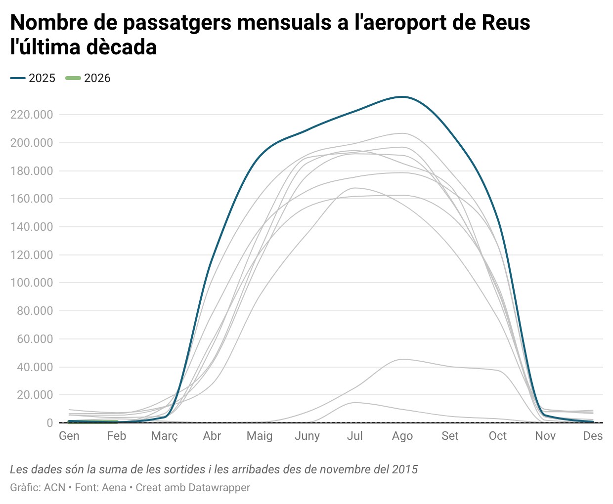 ACN Reus – L’aeroport de Reus ha registrat 1.298 operacions al febrer, un 9,4% més que en el mateix mes de l’any passat. En l’acumulat dels dos primers mesos de l’any, l’aeroport suma 2.360 moviments d’aeronaus, un descens del 4,1% menys en comparació amb el mateix període de 2025. Pel que fa al trànsit de passatgers, segons ha informat Aena aquest dijous, l’aeroport ha registrat 681 viatgers al febrer, un 34,1% més que l’any anterior. Entre gener i febrer d’enguany, el nombre de passatgers ha sigut de 1.270. Al gener es van registrar 589 viatgers, una davallada interanual del 57,3%. També es van reduir un 16,8% les operacions respecte al gener de 2025, una situació que el gestor aeroportuari va atribuir a les condicions meteorològiques adverses.
